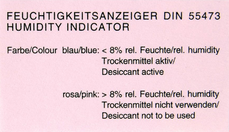 Die Feuchtemesskarte nutzt einen Farbindikator auf Kobalt-Dichlorid-Basis, der seine Farbe je nach Luftfeuchtigkeit ändert.